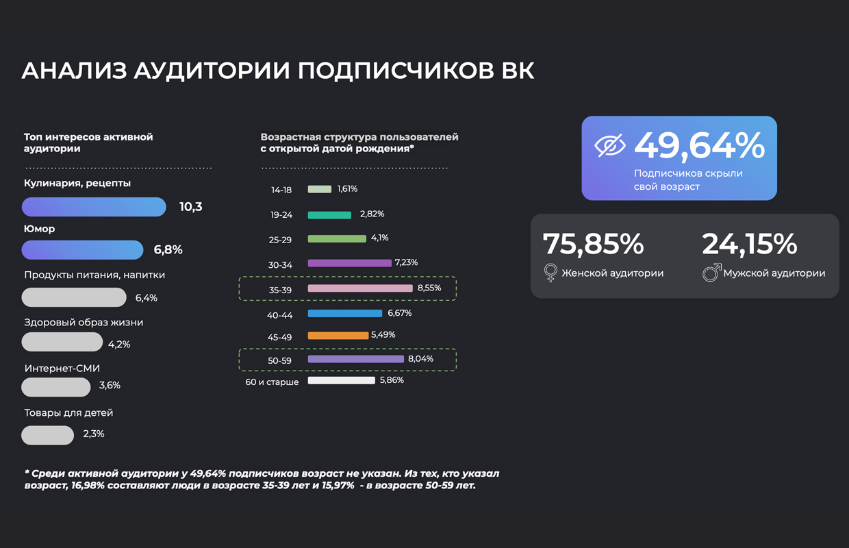 В рамках исследования агентством DOT представлены подробные данные о динамике прироста аудитории и проведен анализ показателя вовлеченности (ER). Отдельно были выделены основные интересы наиболее активных пользователей, а также проанализированы гендерная и возрастная структуры аудитории.