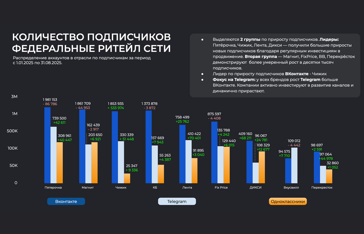 Специалисты DOT Digital Agency осуществили масштабный анализ активности крупнейших федеральных продуктовых ритейлеров и сетевых дискаунтеров в социальных сетях.