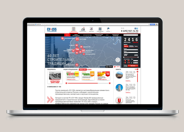 Параллельно с введением в обиход единого фирменного стиля стартовал новый сайт Группы компаний «СУ-155», также разработанный в ДизайнДепо. Сайт su155.ru получил не только принципиально новый дизайн, но и новую логическую структуру. Его разделы«Недвижимость», «Промышленность» и «Инвестиции» содержат сведения о главных направлениях деятельности Группы, а продуманная навигация помогает не потеряться в обилии данных и быстро найти интересующую информацию.