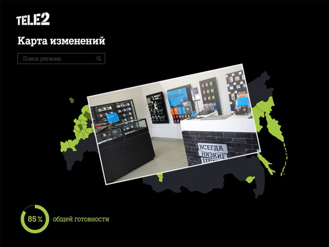 Tele2 требовалось осуществить смену рекламных материалов в салонах связи по всей России. Помимо работы по смене стиля, сотрудникам нужно было отчитаться о проделанной работе. И все это нужно было сделать за 1 ночь.