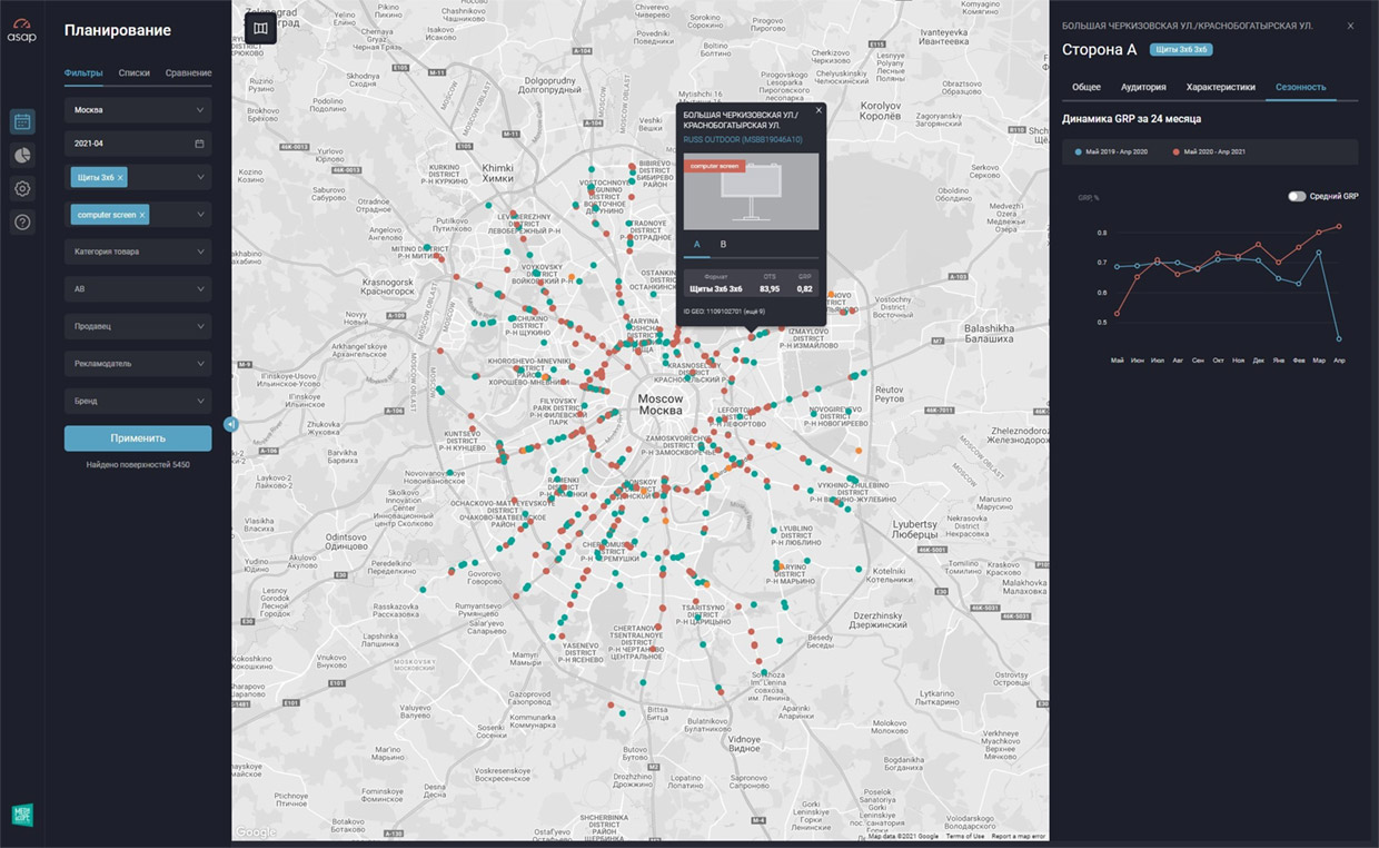 - Оперативный мониторинг — доступ к актуальной и полной информации о размещениях на классических и цифровых конструкциях операторов-участников проекта с точностью до каждого выхода.