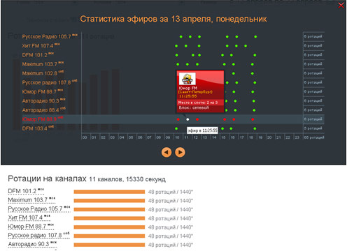 - Статистика появления рекламы на радиостанциях и телевизионных каналах в форме медиаплана или эфирной справки в форматах .xls, .pdf, .html, включающая в себя: хронометраж ролика, время выхода, количество выходов в день по каждой радиостанции, позиция ролика в рекламном блоке, тип ротации;