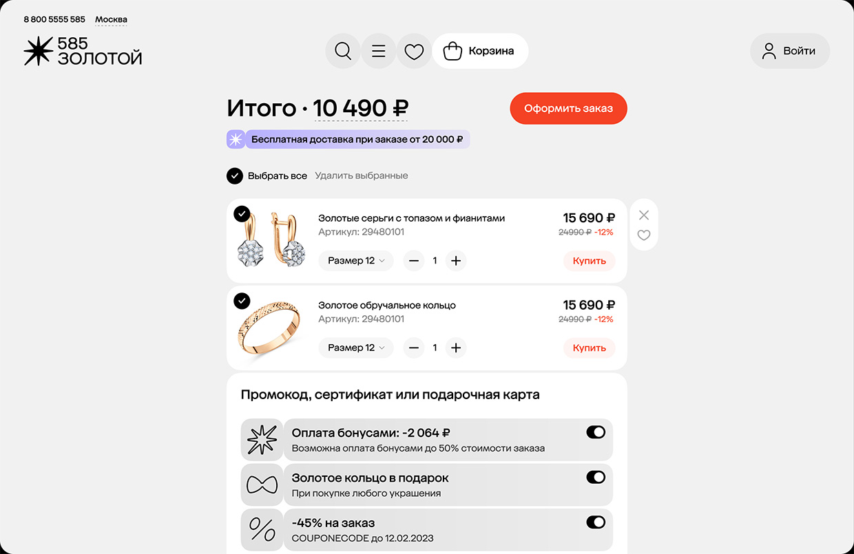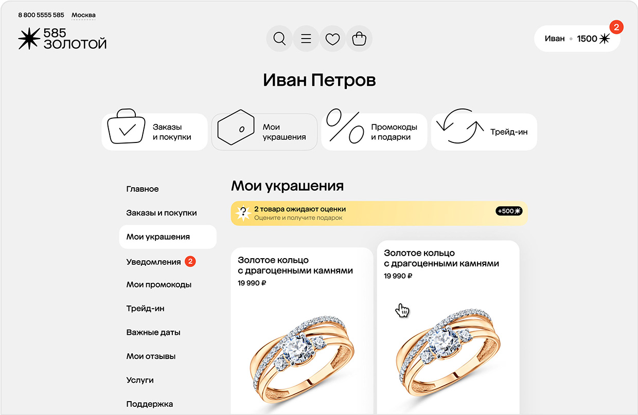 Главная страница обновлённого сайта «585 Золотой» рассказывает обо всём многообразии украшений и показывает выгодные предложения, скидки, акции и персональные рекомендации — пользователь сразу погружается в ассортимент.