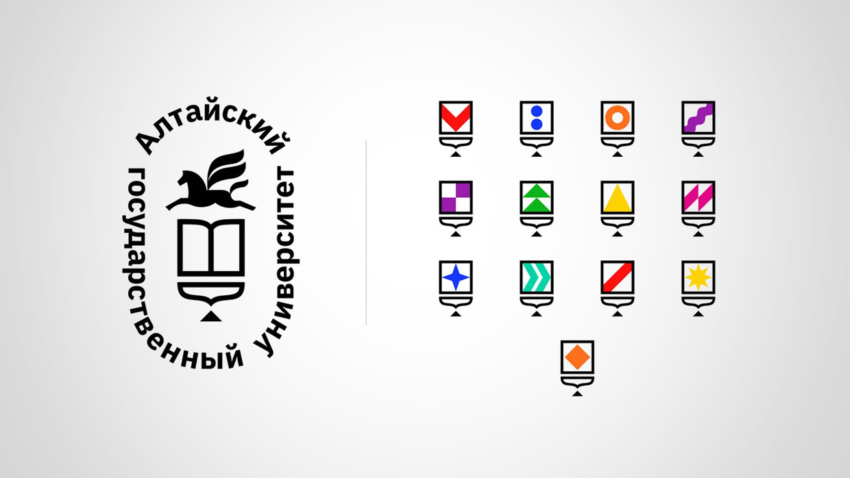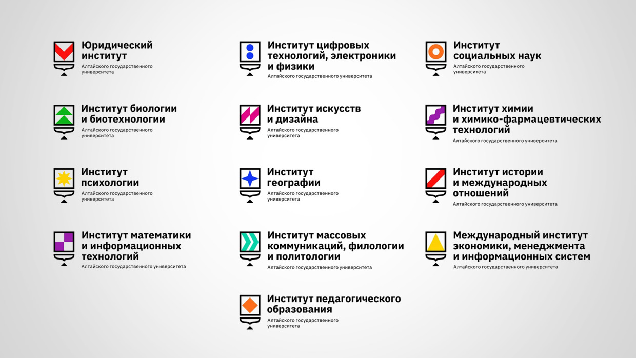 Благодаря формированию новых принципов визуальной коммуникации появилось единство и системность всех продуктов университета. Для институтов «АлтГУ» была разработана айдентика, состоящая из тринадцати знаков.