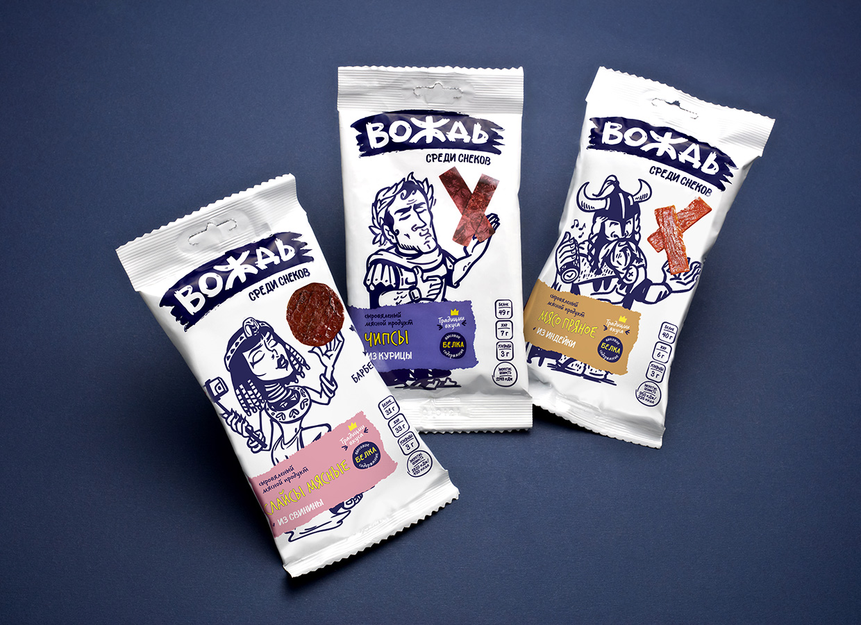 Харизматичные исторические персонажи привлекают внимание потребителя своей яркой индивидуальностью и запоминающимся образом, что вызывает эмоциональный отклик покупателя. Вяленое мясо — традиционно важный продукт для культур по всему миру, что DS1 branding передали через образы исторических персонажей — вождей разных эпох и из разных уголков мира.