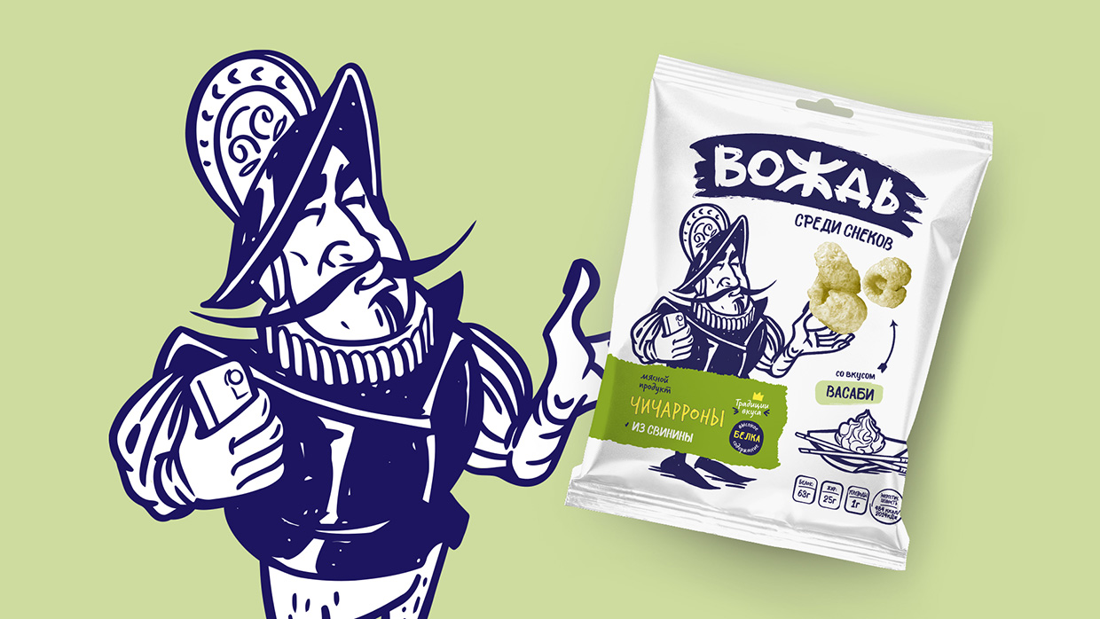 Легенда бренда поддерживается неймингом: «Вождь» — название, которое определяет характер бренда — лидера на рынке по мясным снекам.