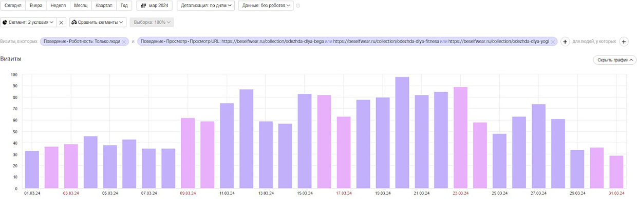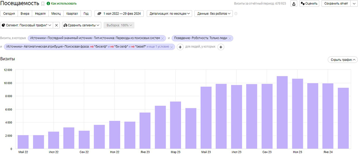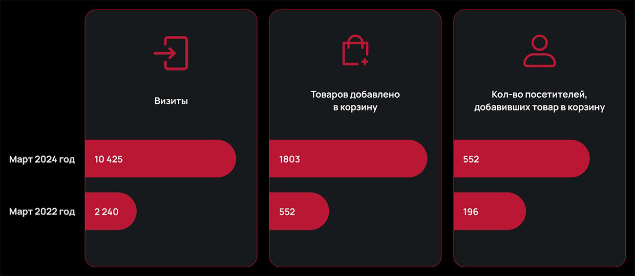 К марту 2024 года в несколько раз выросли такие важные показатели, как визиты, количество товаров, добавленных в корзину, и количество посетителей, добавивших товар в корзину.