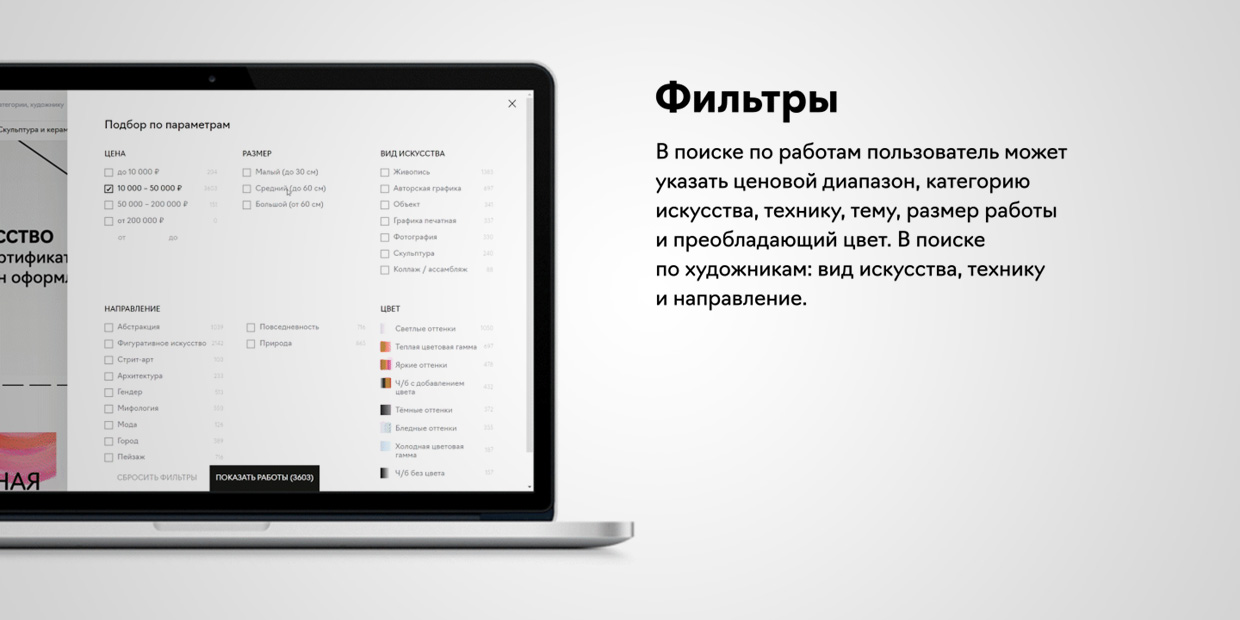 В поиске по работам пользователь может указать ценовой диапазон, категорию искусства, технику, тему, размер работы и преобладающий цвет. В поиске по художникам: вид искусства, технику и направление.