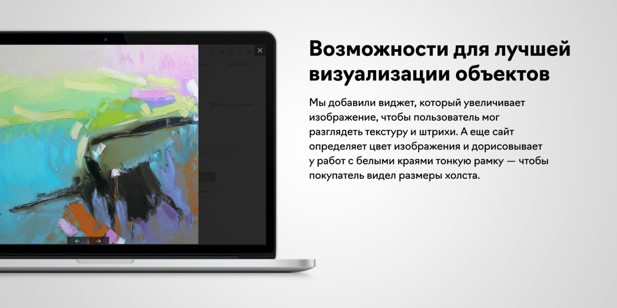 Разработчики добавили виджет, который увеличивает изображение, чтобы пользователь мог разглядеть текстуру и штрихи. А еще сайт определяет цвет изображения и дорисовывает у работ с белыми краями тонкую рамку — чтобы покупатель видел размеры холста.