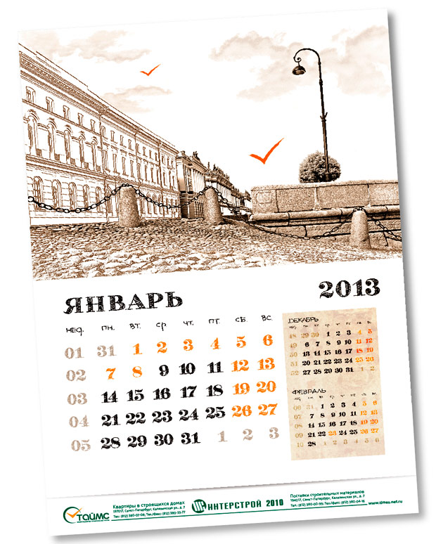 Пример необычного конструктивного решения типа «Моно» с многосоставным вижуалом, позволяющим обновлять календарь в течение года. По прошествии месяцев, на исходное изображение накладываются новые элементы. Принцип их расположения напоминает создание мультипликации в доцифровую эпоху. В результате был создан образ последовательного развития городской застройки с характерными признаками смены времен года в Петербурге.