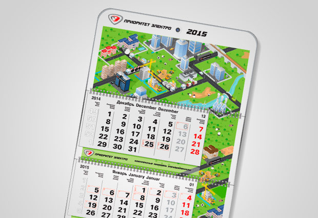 Каждая деталь иллюстрации этого календаря напоминает о деятельности компании-заказчика. Изображение стилизовано под мобильную игру-стратегию: невозможно пропустить и очень интересно разглядывать множество мелких, но тщательно проработанных элементов «карты». В результате, получатель календаря радуется приятному сувениру, а даритель – качественному и продолжительному контакту со своим брендом.
