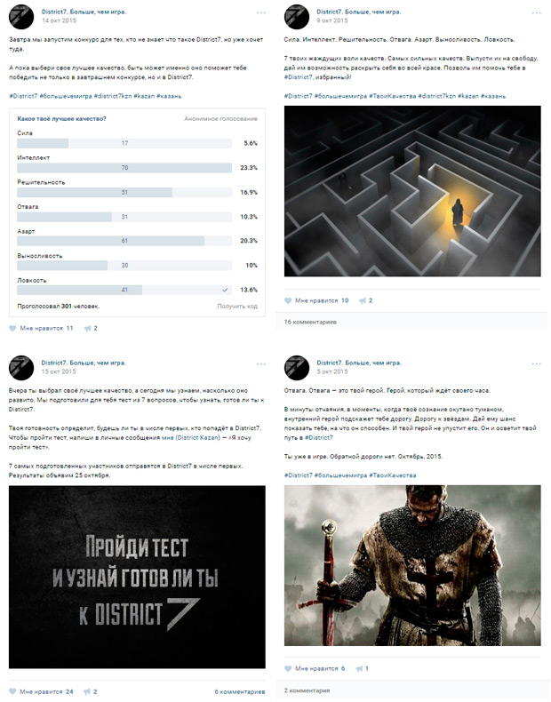 - Конкурс «Готов ли ты к District7?» — 160 участников, 15 вовлечённых подписчиков