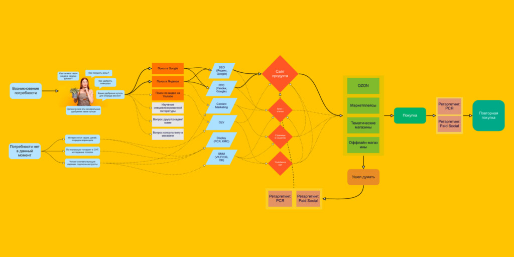Команда JetStyle продумала весь путь пользователей — от возникновения потребности в удобрениях до повторной покупки. Из-за внешних факторов некоторые инструменты стали недоступны, но из оставшихся вариантов был создан микс, с помощью которого можно получить большую конверсию за меньшую цену: