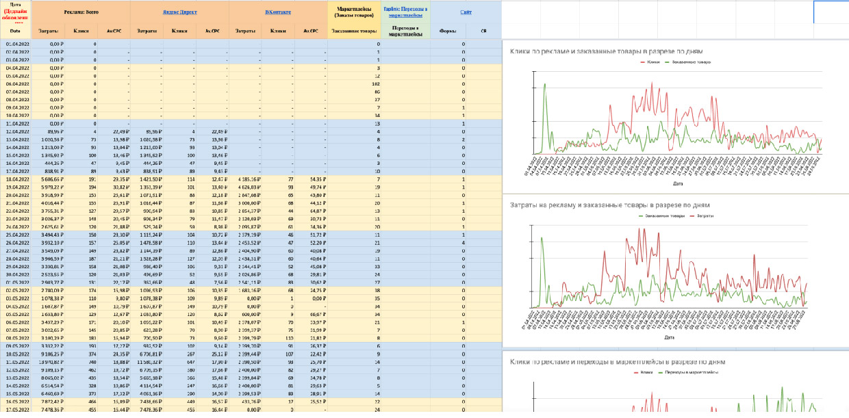 Возможности собирать данные о поведении пользователей на маркетплейсах в привязке к рекламе не существует, поэтому в JetStyle придумали лайфхак и сопоставили данные рекламных систем, сайта и маркетплейсов в одной сводной таблице. По ней специалисты строили графики и искали закономерности.