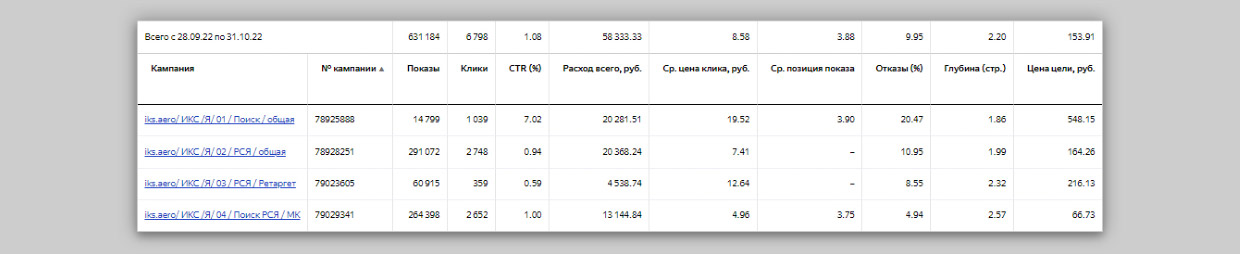 Анализ статистики и семантики старых кампаний показал, что было много нецелевых переходов по рекламе. Например, на поиске использовались информационные ключи (пользователи искали информацию, а не товар для приобретения), соответственно, по ним были переходы, но не было ни лидов, ни продаж. Изучив картину, агентство собрало тематики, которые нужно отсечь.