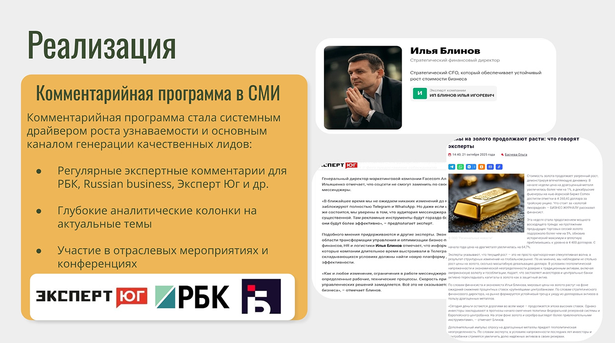 - Регулярные экспертные комментарии. Налажено сотрудничество с РБК, Russian Business, «Эксперт Юг». Илья стал постоянным экспертом по финансовым и управленческим темам.