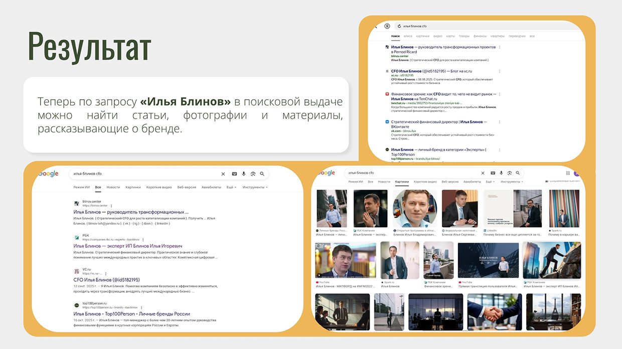- Цифровой след как доказательство экспертизы. По запросу «Илья Блинов» в поисковой выдаче теперь можно найти десятки статей и материалов. Вместо информационного вакуума — сформирована полная и контролируемая картина, что является фундаментом доверия для топовой аудитории.