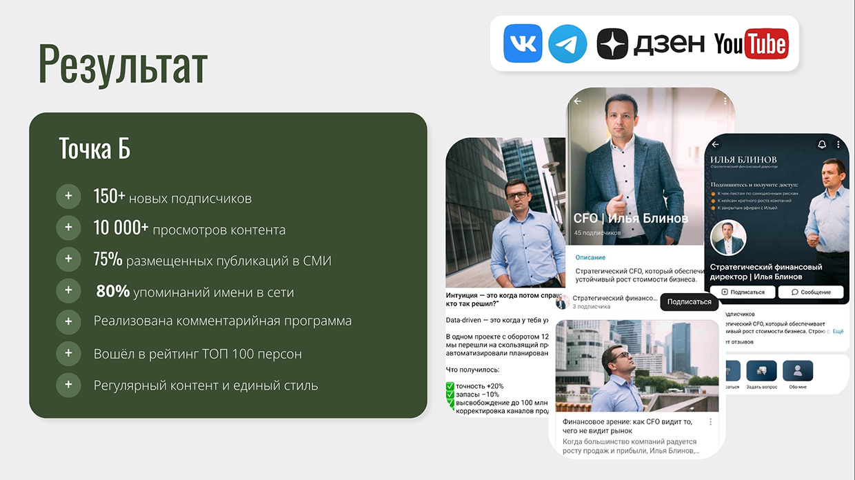 - Связь личного бренда и бизнес-целей. Сформированное сообщество и укреплённый статус создали прочную основу для будущей монетизации, трансформируя личный бренд из «известности» в реальный бизнес-актив.