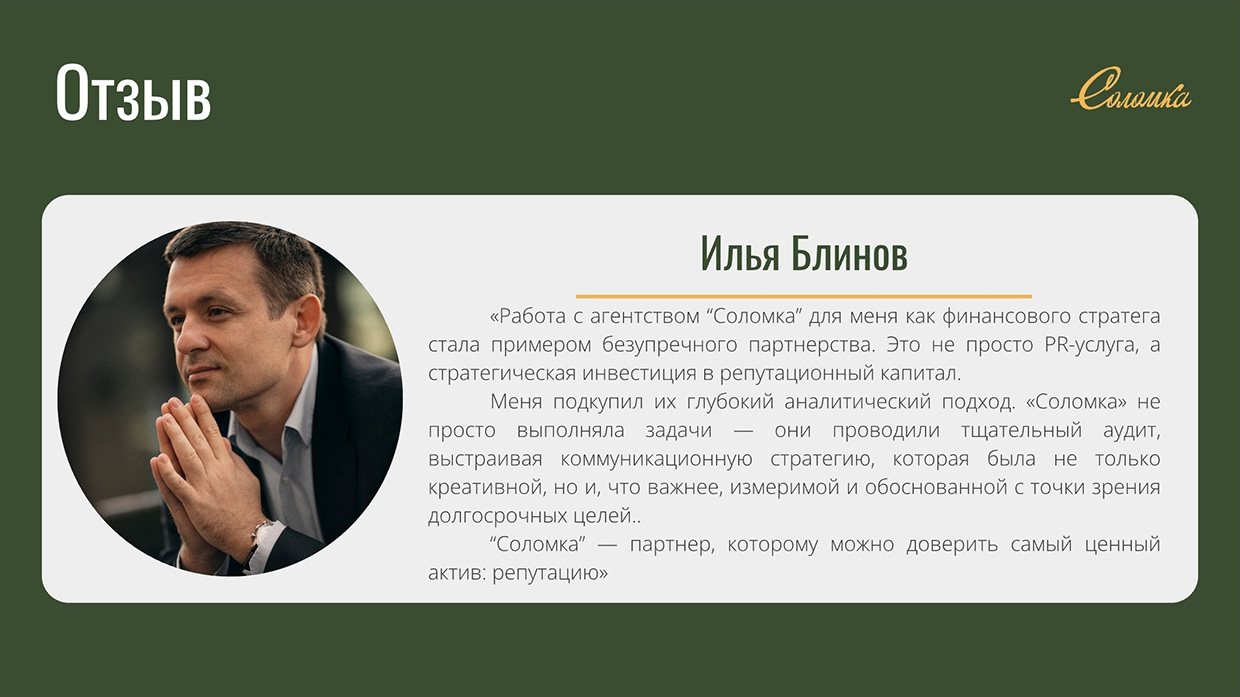 Креативное PR-агентство «СОЛОМКА» занимается упаковкой, развитием и продвижением личных брендов, реализует комплексные PR-стратегии продвижения компаний, предлагает полный спектр услуг в области интернет-маркетинга: от разработки сайтов, запуска таргетированной и контекстной рекламы до управления репутацией, SMM и организации коллабораций с блогерами.