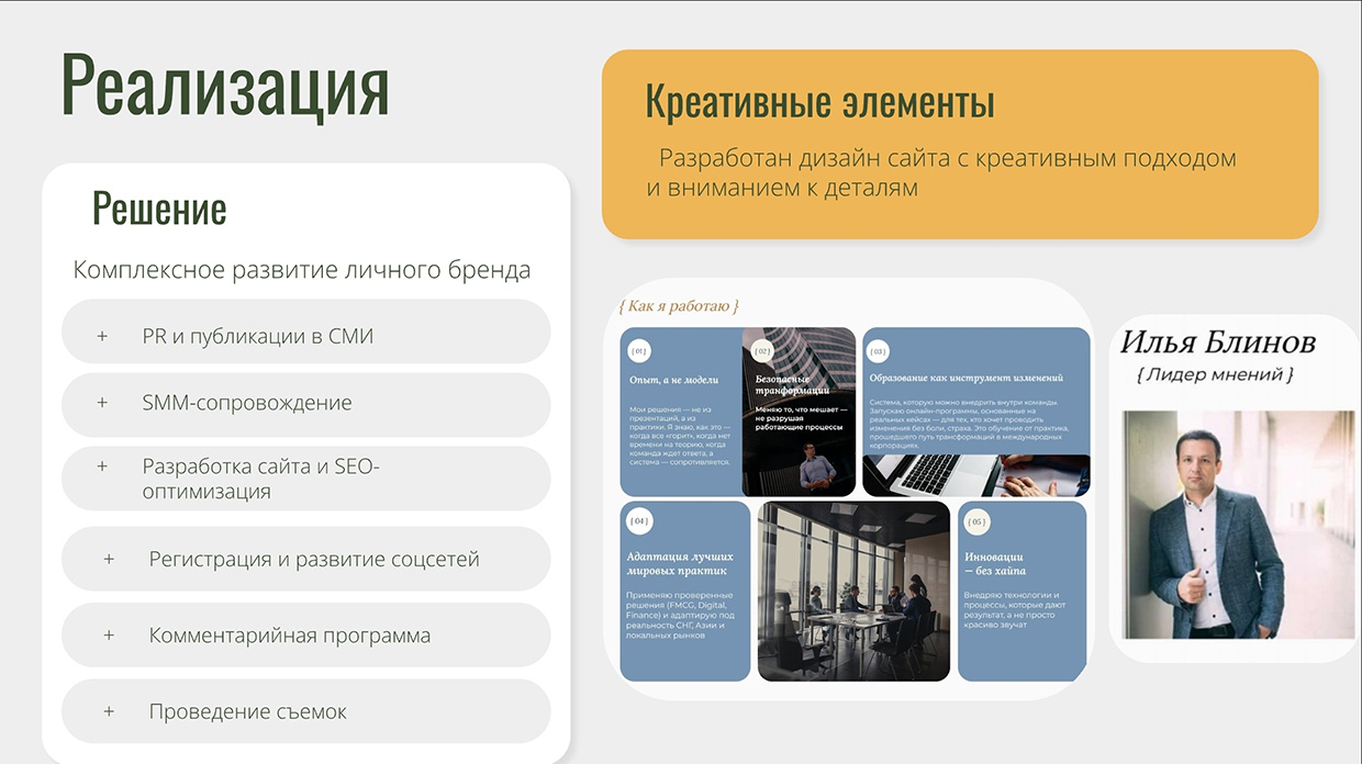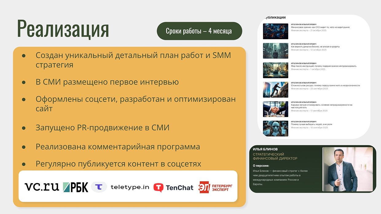 Системная работа над личным брендом Ильи на 4 месяца была выстроена в несколько ключевых этапов: разработка стратегии и фирменного личного стиля, ведение SMM и создание контент-стратегии, проведение фотосессии, организация PR и медийного продвижения, поисковая оптимизация и улучшение цифровой видимости.