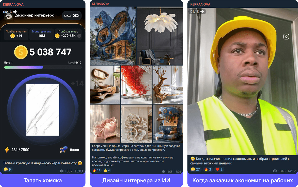 В отличие от конкурентов, JetStyle активно внедряли в канал KERRANOVA динамичный контент, включая видео и GIF-анимацию, что помогло разнообразить ленту и привлечь внимание широкой профессиональной аудитории — архитекторов и дизайнеров интерьеров.