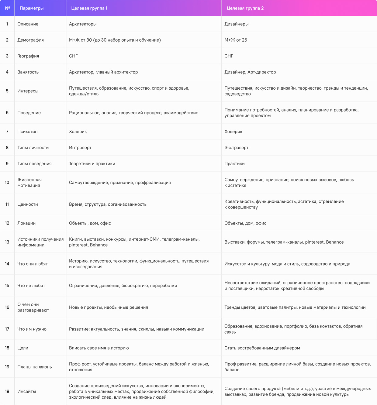 Специалисты провели детальный анализ тематики, чтобы понять текущие тренды и интересы в сфере дизайна и архитектуры — это позволило выделить ключевые сегменты аудитории и охарактеризовать их.