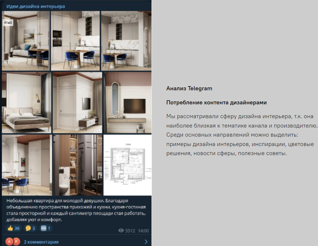 Специалисты изучили, какие типы контента наиболее популярны у конкурентов и как они взаимодействуют с аудиторией. Выяснилось, что акцент на использование качественных рендеров и эстетичных фотографий оказался успешным, так как именно такие материалы вызывают наибольший отклик у аудитории.