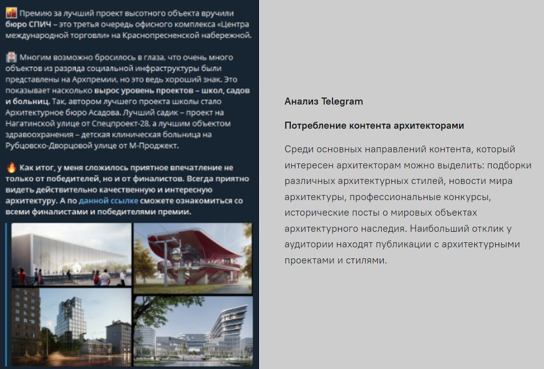 - Новости — для формирования образа медиа, освещающего ключевые события в архитектуре и дизайне. Для этого команда проекта публикует регулярные дайджесты с актуальными новостями и визуально привлекательными фото, а также делится историями о знаковых проектах мировой архитектуры, чтобы вдохновить аудиторию и поддерживать её интерес.