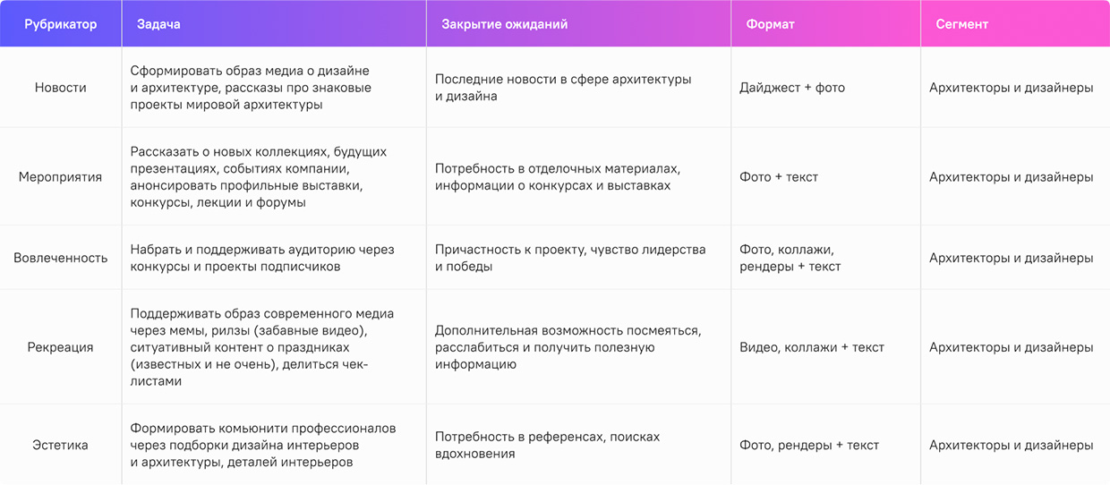 На старте работы перед командой агентства была поставлена задача развития канала, объединяющего дизайнеров и архитекторов. Основные шаги включали: