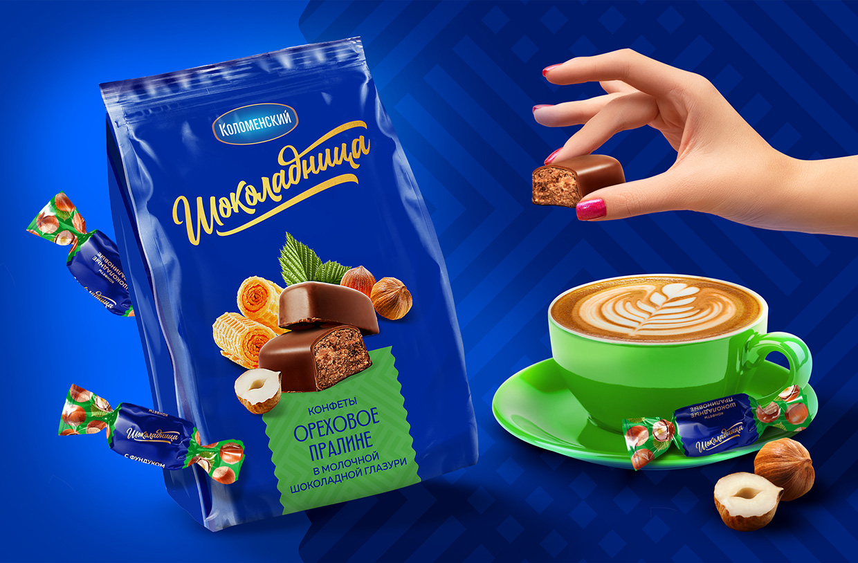 Было также сделано усиление брендинга: логотип «Шоколадница» увеличен, очищен от близко расположенных элементов, вынесен в верхнюю часть упаковки. Логотип производителя «Коломенский» также получил акцентную позицию и стал «знаком качества».