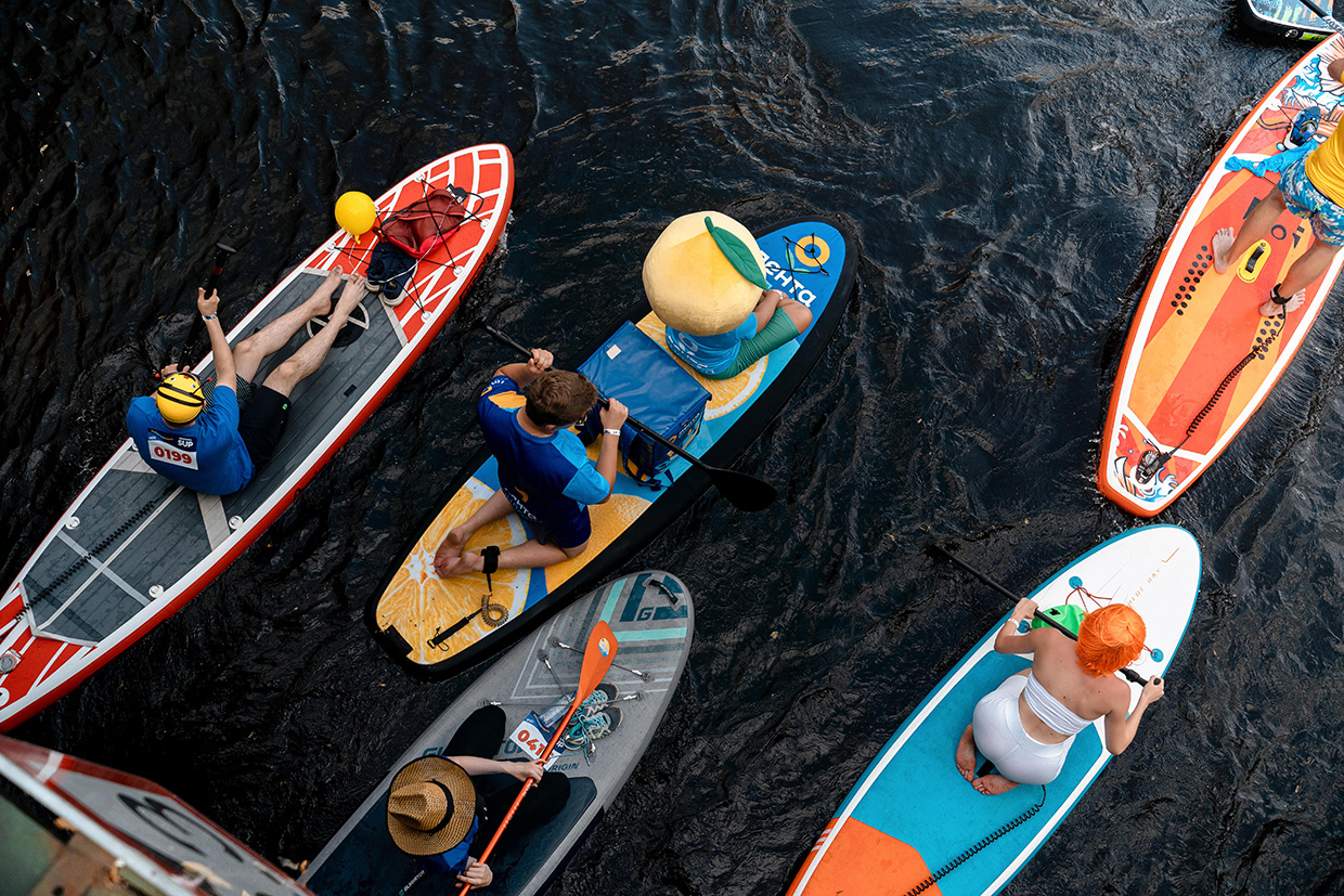 Более 6000 сапсерферов проплыли 6 августа 2022 года по рекам и каналам Санкт-Петербурга почти 9 километров — ничего подобного в России еще не было. На самом масштабном SUP-фестивале в Европе было решено провести параллель с «Лентой Онлайн», где можно заказать продукты, а также одеть участников брендированной команды в ростовые куклы фруктов.