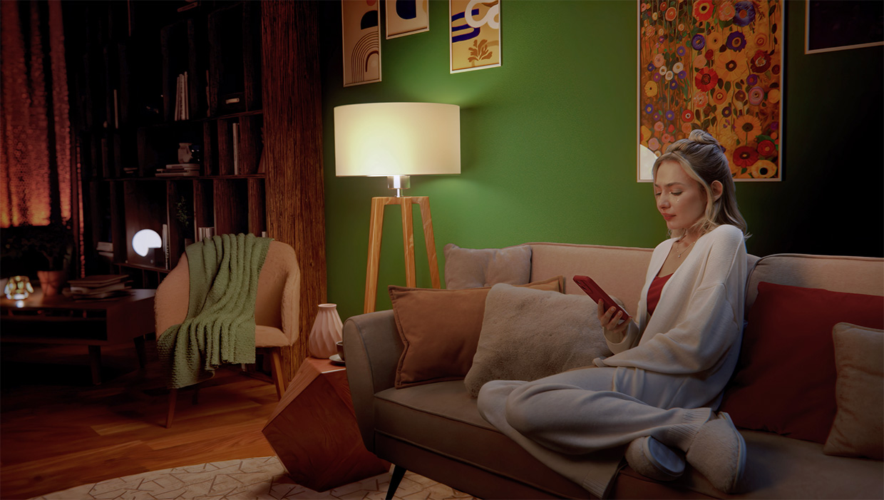 Квартира девушки, как и волшебный завод, была полностью создана с помощью ИИ-генераций и CG-графики, за исключением реально существующего дивана и нескольких объемных элементов.