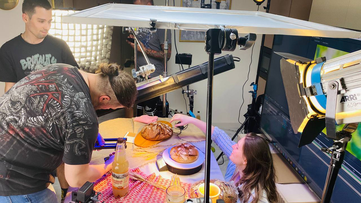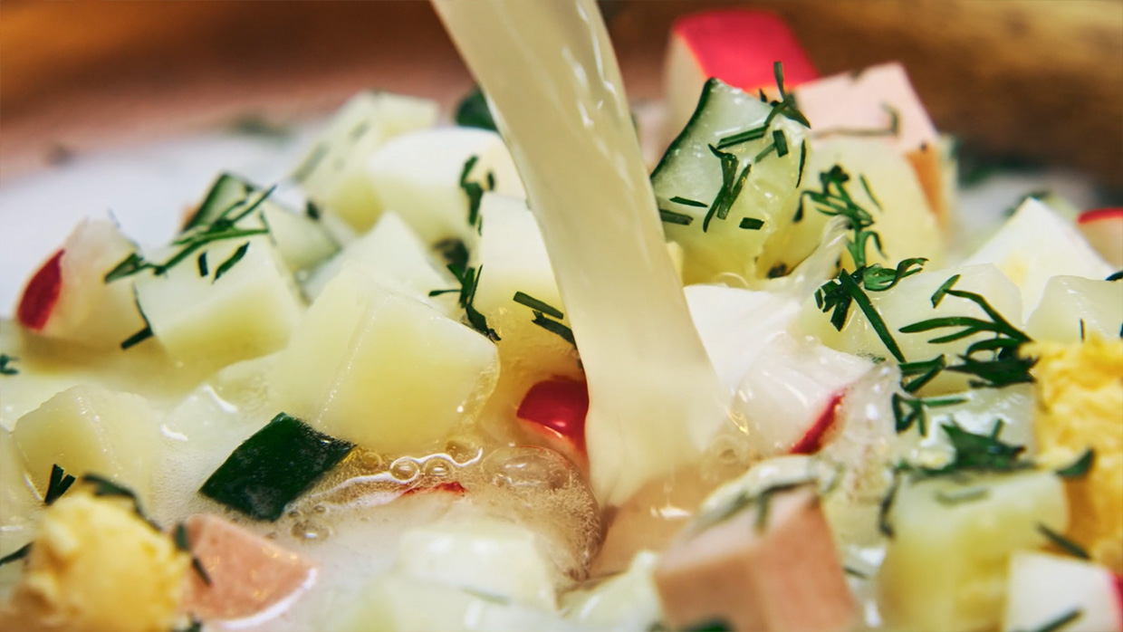 По итогу разработки креативной концепции клиенту была представлена идея, принятая без правок. Согласно идее в ролике необходимо было показать свежий ароматный хлеб и окрошку.