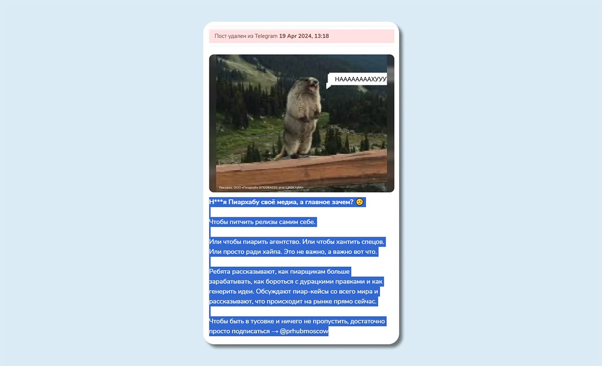 Посты «Пиархаба» бесплатно репостили крупные пиар-каналы. Самый главный репост, который получили — от Лобушкина — пиарщика, в канале которого порядка 100 тысяч подписчиков.