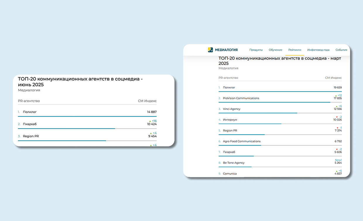 Благодаря телеграм-каналу и вовлечению в него релевантной аудитории, «Пиархаб» стали замечать чаще. Это дало результат: Пиархаб в 2025 году попал в рейтинг коммуникационных агентств от «Медиалогии» и занял в нём 2, 5 и 7-е места. На позицию в рейтинге влияло присутствие и активность «Пиархаба» в соцмедиа. Агентству удалось добиться системного внимания к бренду.