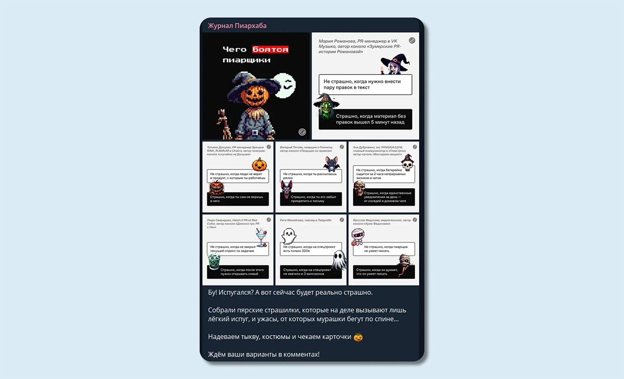 К Хеллоуину выпустили пост-страшилку: сходили к знакомым пиарщикам и спросили их, чего они боятся в работе. В ответах — жиза: «Забыл прикрепить к письму релиз», «Опубликовал пост без правок», «Открыл новый спринт, не закончив старый». Они отвечали на вопросы парой предложений, а редакторы делали из этого полноценные посты.