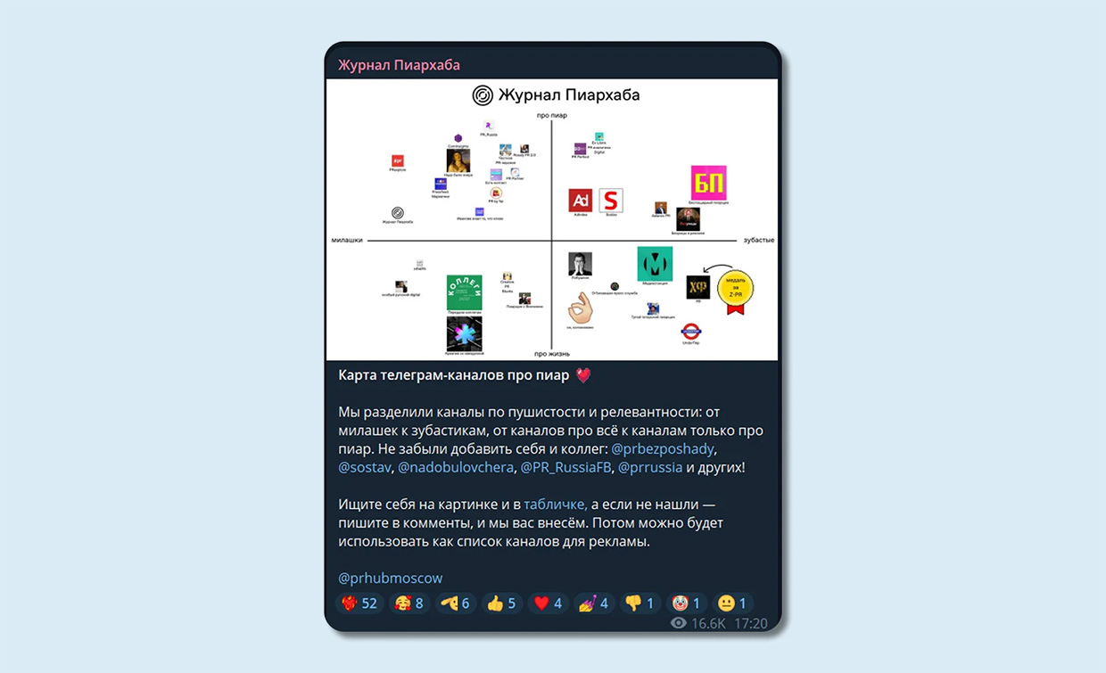 Карта завирусилась. Каналы узнавали себя, делились постом, спорили, просили включить их в следующий апдейт. Карта разошлась по всей PR-тусовке: без рекламного промо — только за счёт виральности формата.