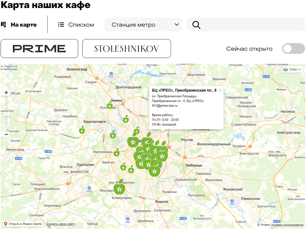 - Для удобного поиска заведений была создана страница "Контакты", на которой пользователь можно выбрать то, как показывать адреса кафе: на карте или списком. Их можно отфильтровать по близости к нужной станции метро. Также был реализован поиск кафе по названию улицы, а также по заведениям, которые открыты в настоящий момент. По клику на точку на карте по каждому кафе всплывает окно с дополнительной информацией (название, адрес,