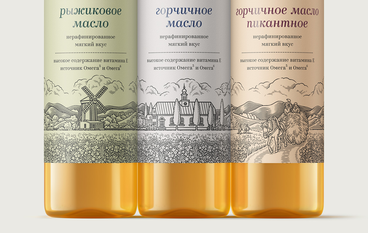 В Tomatdesign разработали дизайн для упаковок линеек масла, для горчичных соусов и порошка — хорошо организованная структура дизайна позволяет легко адаптировать продуктовый портфель торговой марки.