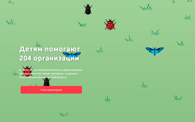 Например, партнеров изобразили в виде божьих коровок и жучков, которые ползут и тянут за собой плашки с логотипами или надписями. Так как партнеров оказалось более 400, специалисты разработали решение на специальном графическом движке Pixi.js.