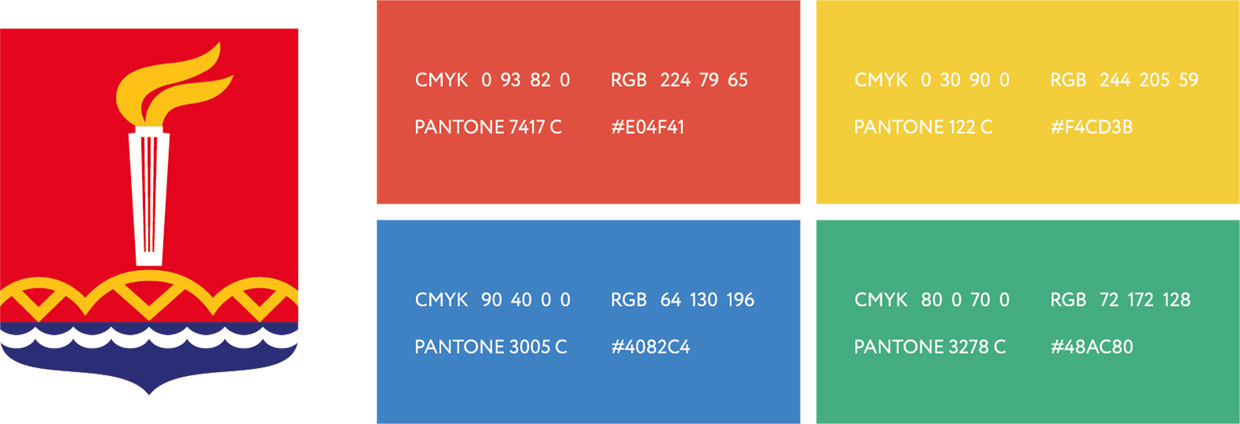 Отчасти строгий линейный прием дополняется актуальными цветами. Основными фирменными цветами стали цвета, близкие к палитре герба города: красный, жёлтый, синий и белый. Плюс зеленый как цвет природы и роста.