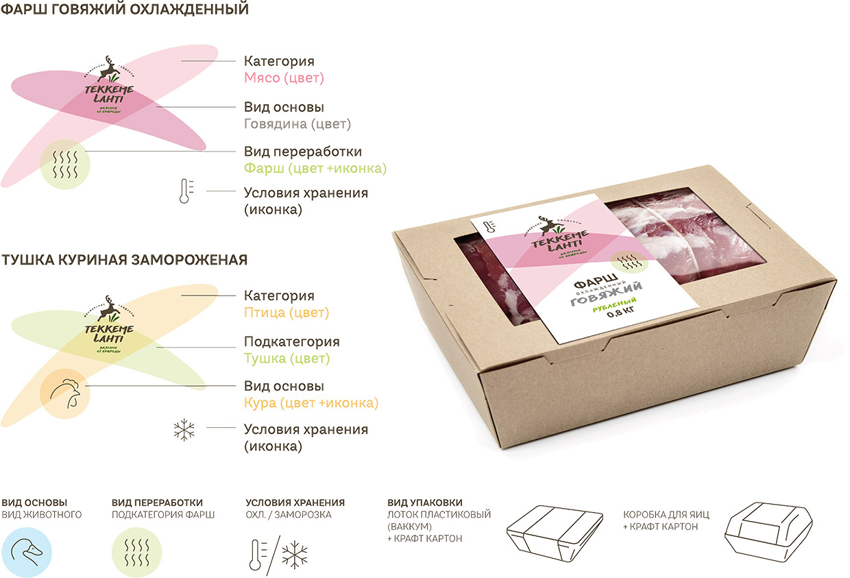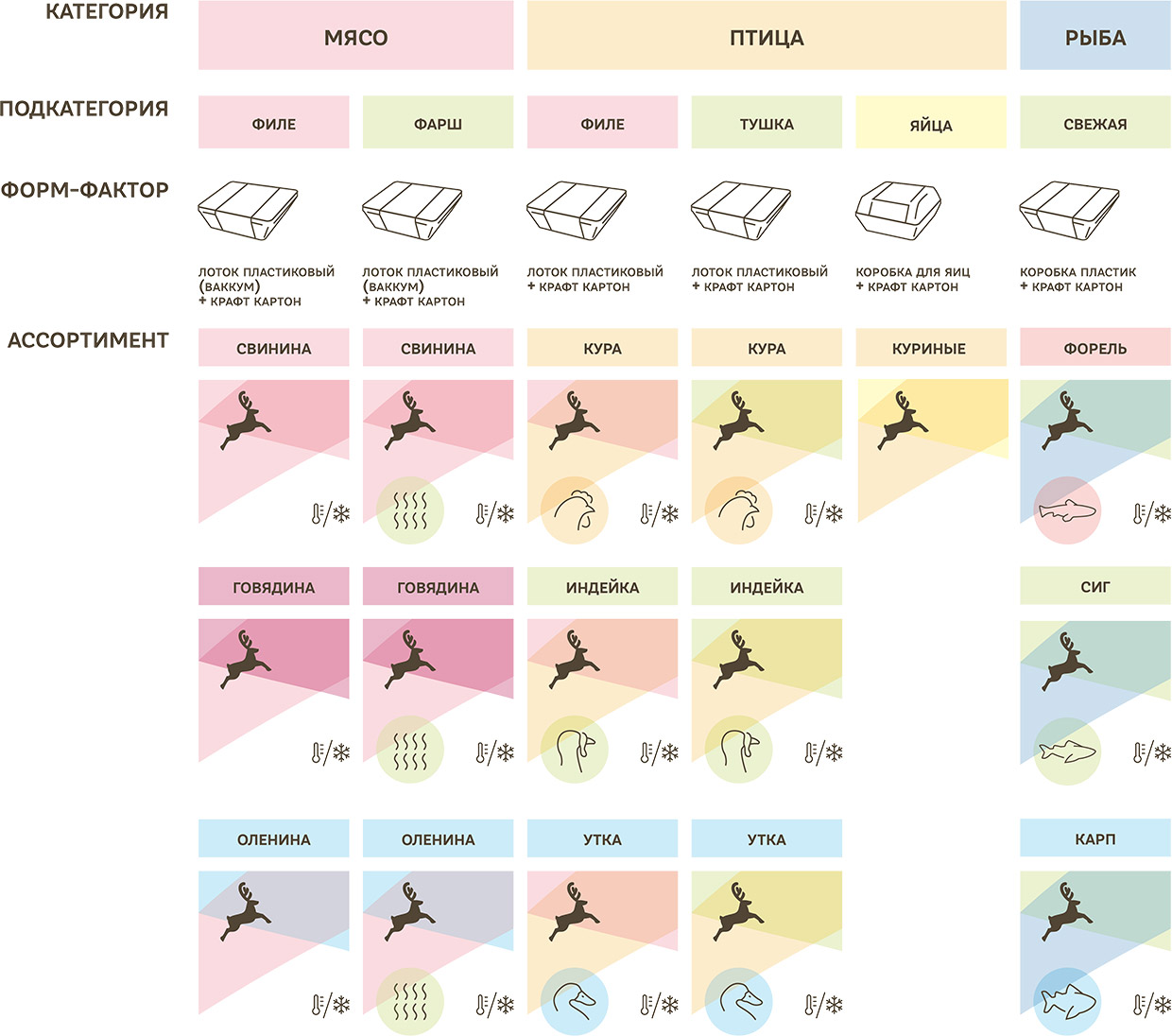 В связи с этим для каждой категории продуктов были разработаны индивидуальные цветовые решения и клеймы, объединенные в целостную визуально-архитектурную матрицу, которая станет основой и руководством при создании новых вариаций упаковки.