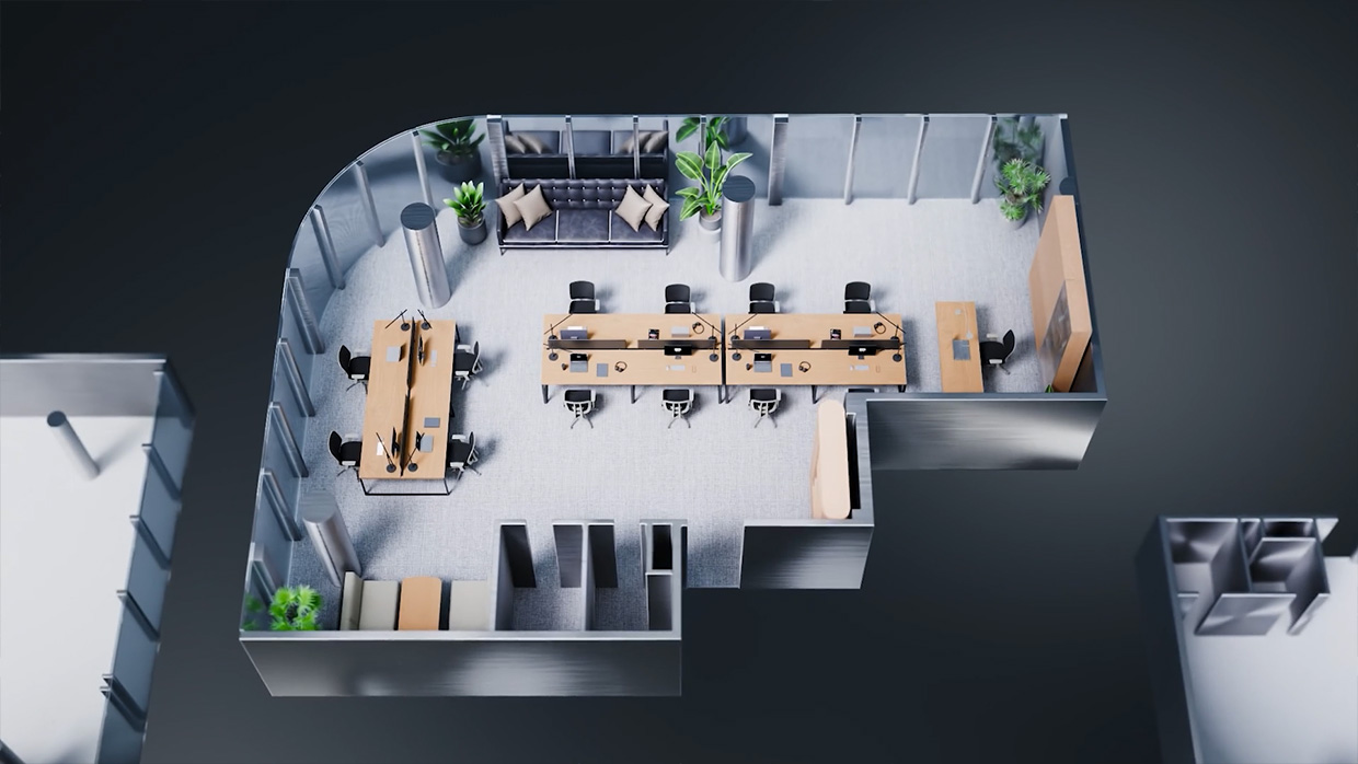 Использовать чужие локации — тоже не вариант, так как бизнес-центр AIR — это премиальный проект, и снимать его в каком-то похожем офисе означало бы потерять уникальность и нарушить целостность имиджа. Обычные слайд-шоу из рендеров — скучно и не соответствует уровню проекта. Нужно было искать другое решение.