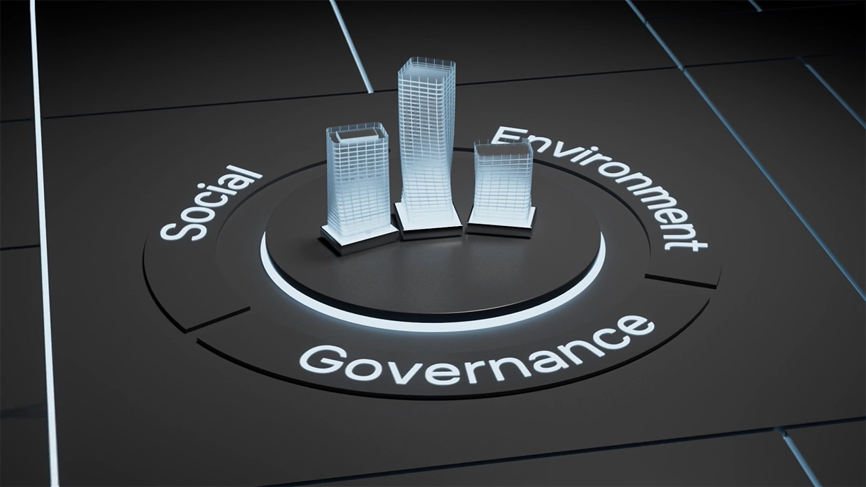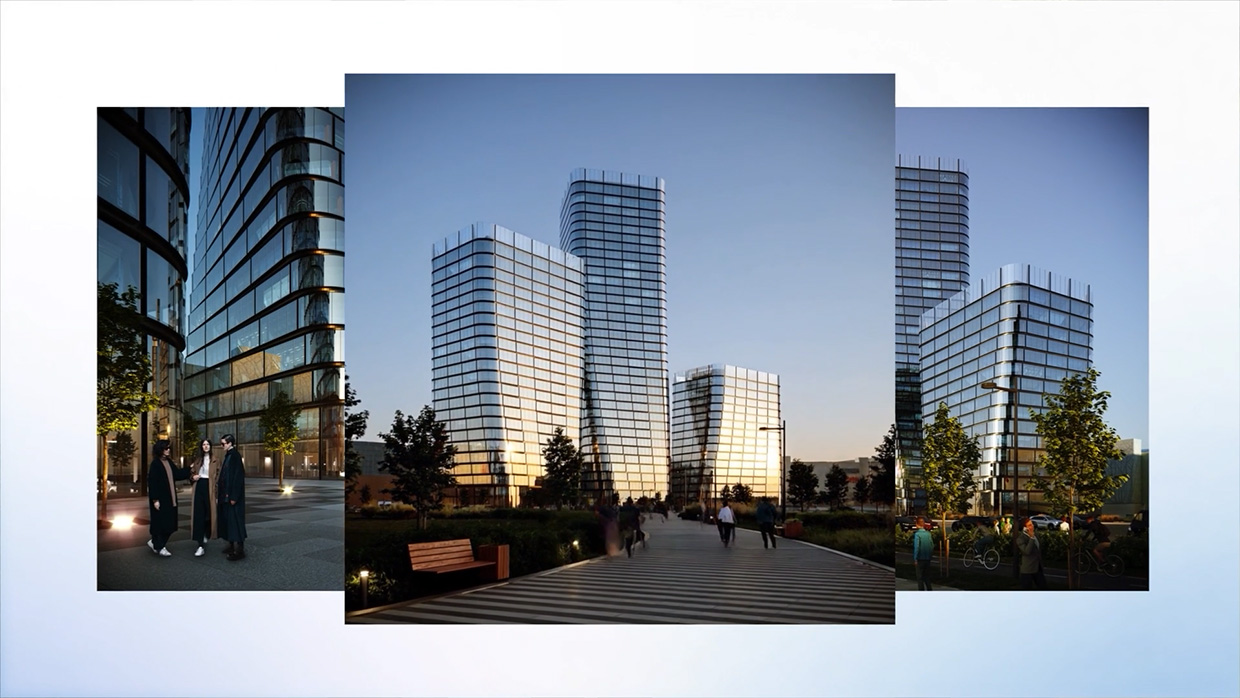Помимо героев, специалисты оживили и сам бизнес-центр: использовались рендеры зданий и накладывались движения камер, а также добавлялось реалистичное освещение, чтобы создать атмосферу живого пространства.