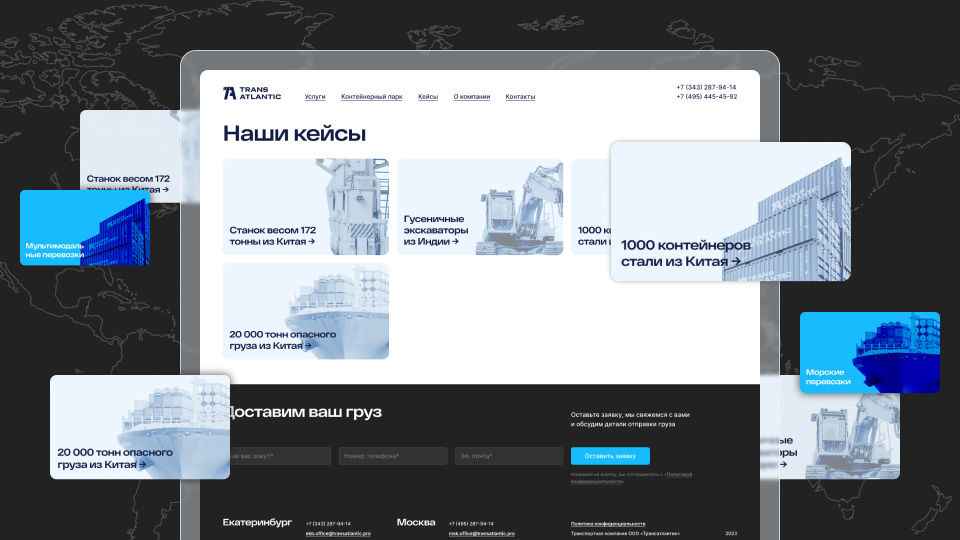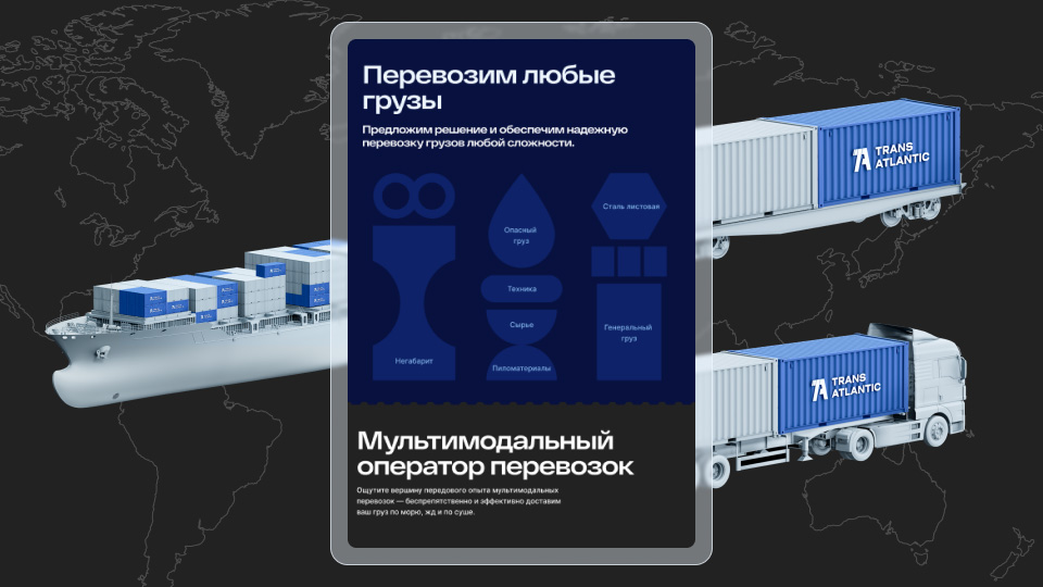 Как и для подачи информации, так и для визуального стиля JetStyle выбрали лаконичность. Для фона использовали оттенки серого, а для расстановки акцентов — оттенки синего, в цвет фирменных контейнеров «ТрансАтлантик».
