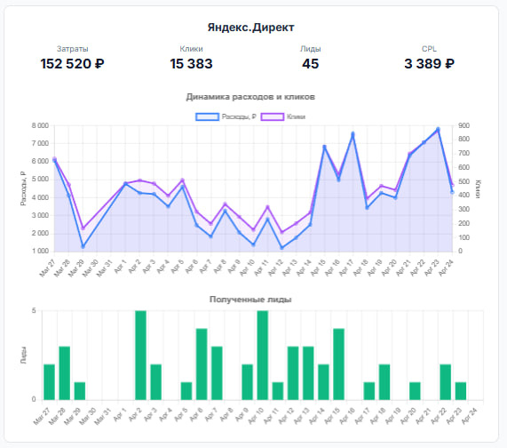 | Яндекс.Директ | 152 520₽ | 3 389 ₽ | 45 |