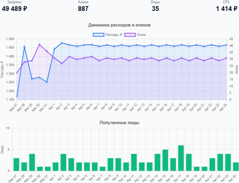 Детальная статистика из ВКонтакте, показавшая более высокую эффективность: затраты — 49 489 рублей, 35 лидов, CPL — 1 414 рублей.