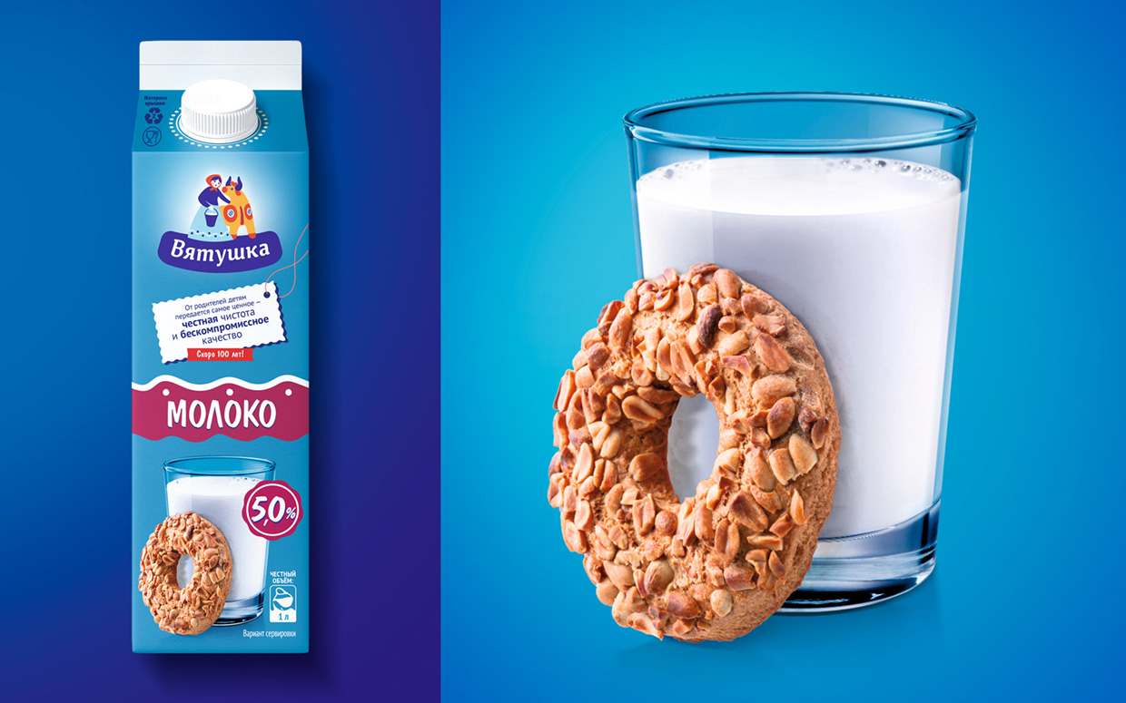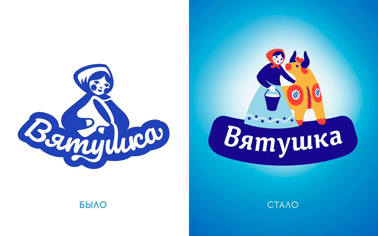 В предыдущем варианте на упаковке была изображена девушка — доярушка в косынке, которая много лет была неотъемлемой частью упаковки. Эта девушка и есть «Вятушка» — добросовестная труженица из Вятки.