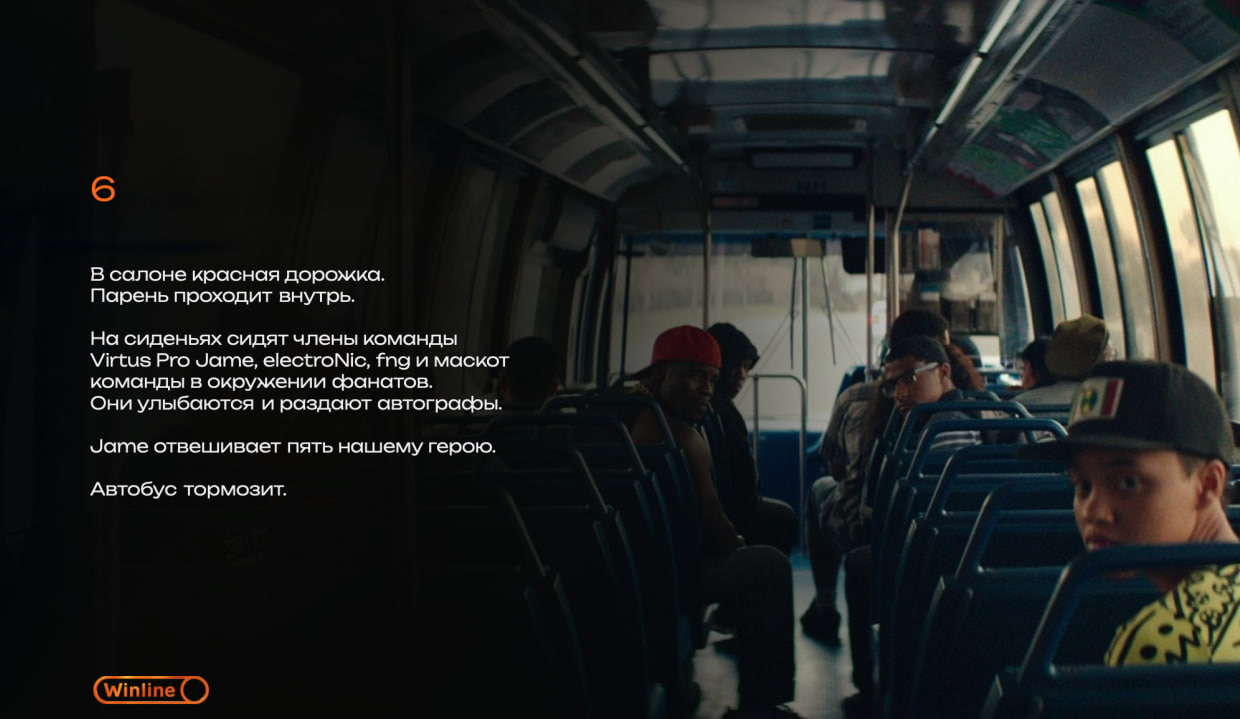 Герой просыпается в своей комнате, а вокруг оживают персонажи из Dota 2 и Counter-Strike. Он едет в брендированном автобусе Virtus.pro, попадает на премию и киберспортивный турнир — и всё это благодаря Winline.