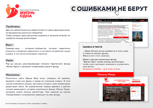 - Первое место — «На пределе» Брекоткина Яна, Агентство маркетинговых коммуникаций e:mg